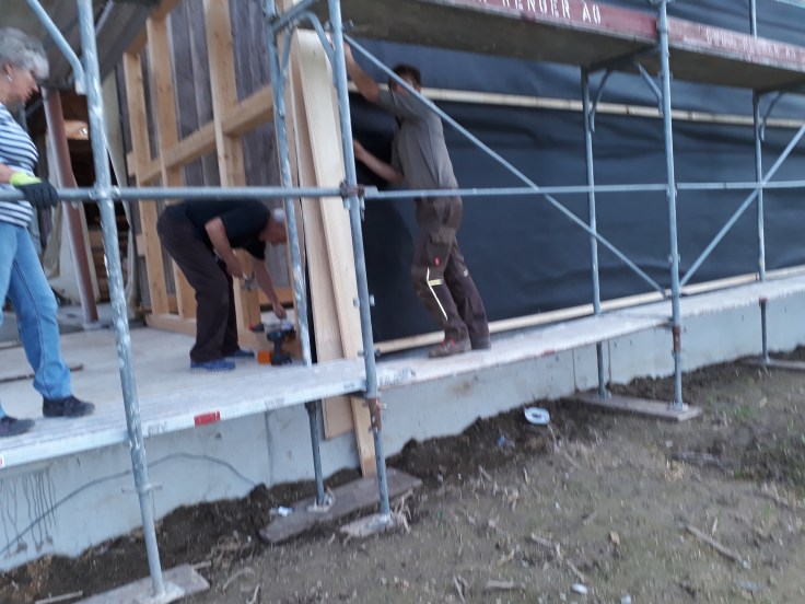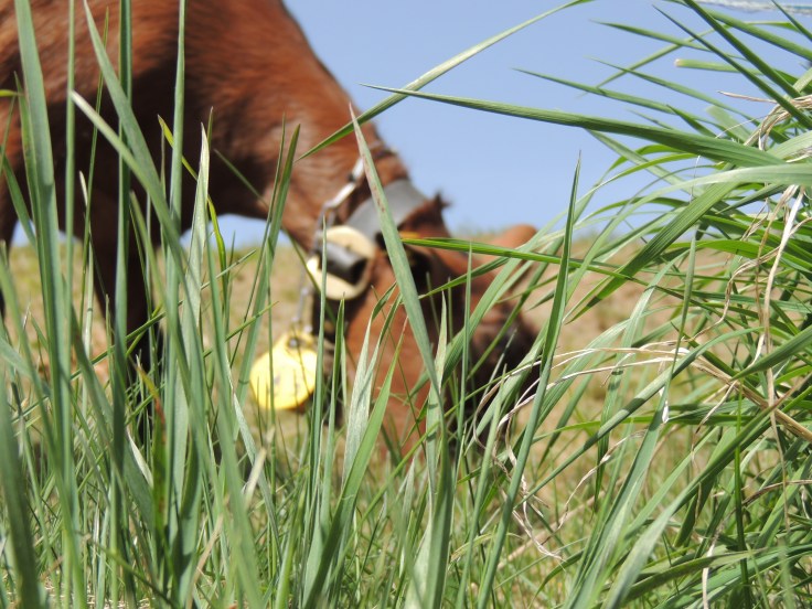 Anschliessend wurden die Aufzuchtgitzi auf eine grosse Weide mit Stall ausgesetzt. Hier verbringen sie nun den Sommer mit 3 älteren Ziegen und 3 Böcken.Die Aufzuchtgitzi vom August 2019 an die Weide gewöhnen. Sie sind sehr unsicher, da um jeden Baum viel Zaun für den Stammschutz montiert wurde.