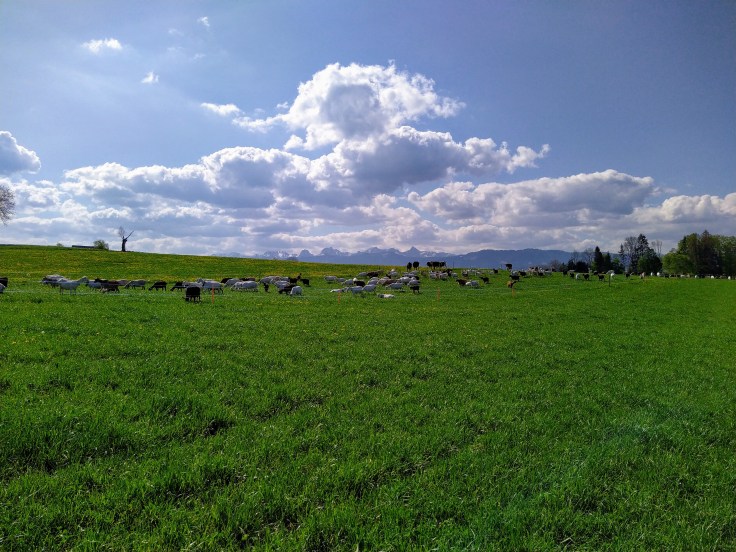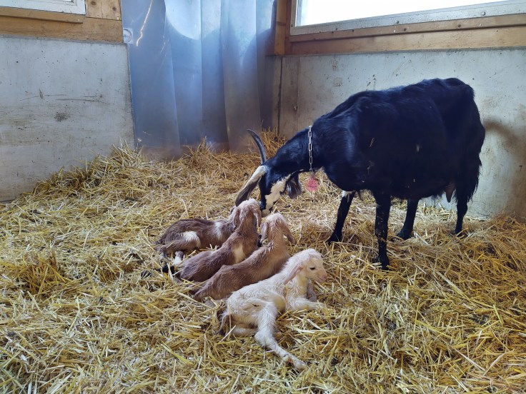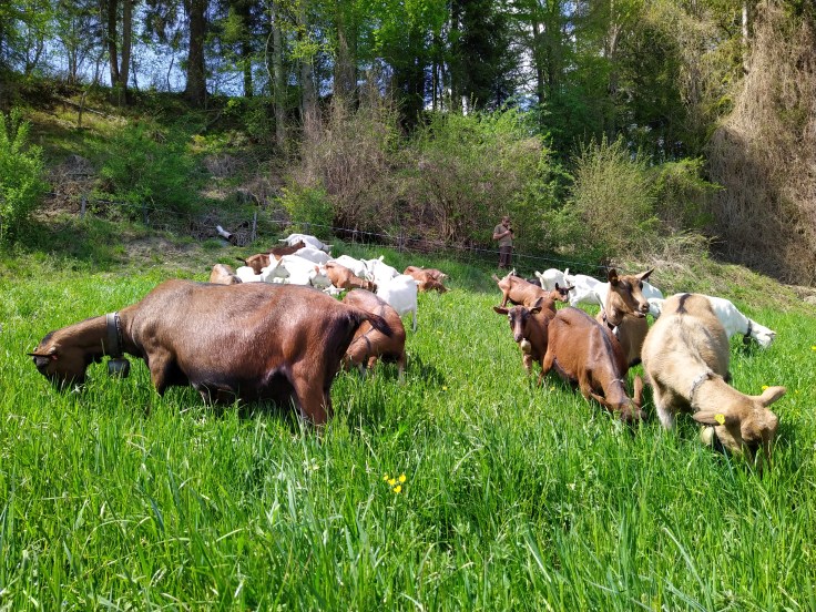 Die Gitzisaison hat bei uns nach Ostern begonnen. Diesen Frühling hatten wir viele Mehrlingsgeburten. Der Kindergarten haben wir direkt im Ziegenstall eingerichtet, was sehr interessant für die Gitzi und Ziegen sind. Anschliessend werden die Gitzi im alten Kuhstall eingeschult. Dort können sie selbständig am Milchautomaten von unser Kuhmilch trinken, sich austoben und im Stroh schlafen.Weidebeginn Frühling 2020